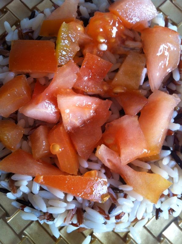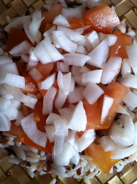 Seguidamente, el tomate y la cebolleta. Todo encima del arroz.