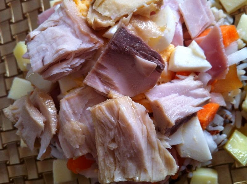 A continuación, ya con el arroz bien escurrido, empezaremos a montar la ensalada. Como siempre os digo, podéis hacerlo como mas os guste. Pero aquí os explico como la he montado yo.