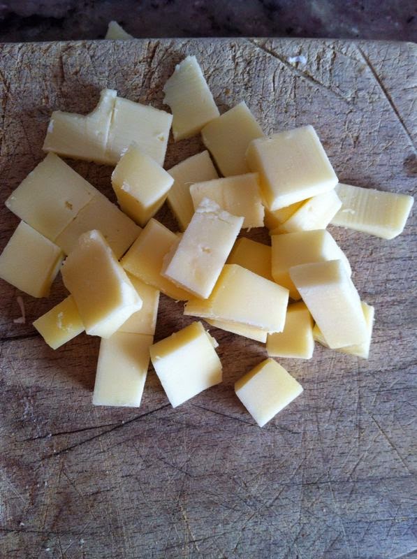 El queso de nata (crema de leche), lo cortaremos en cuadraditos al igual que el jamón cocido.