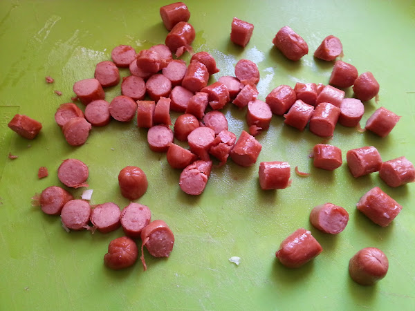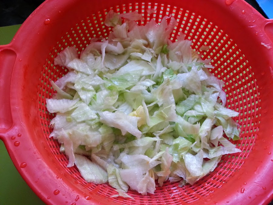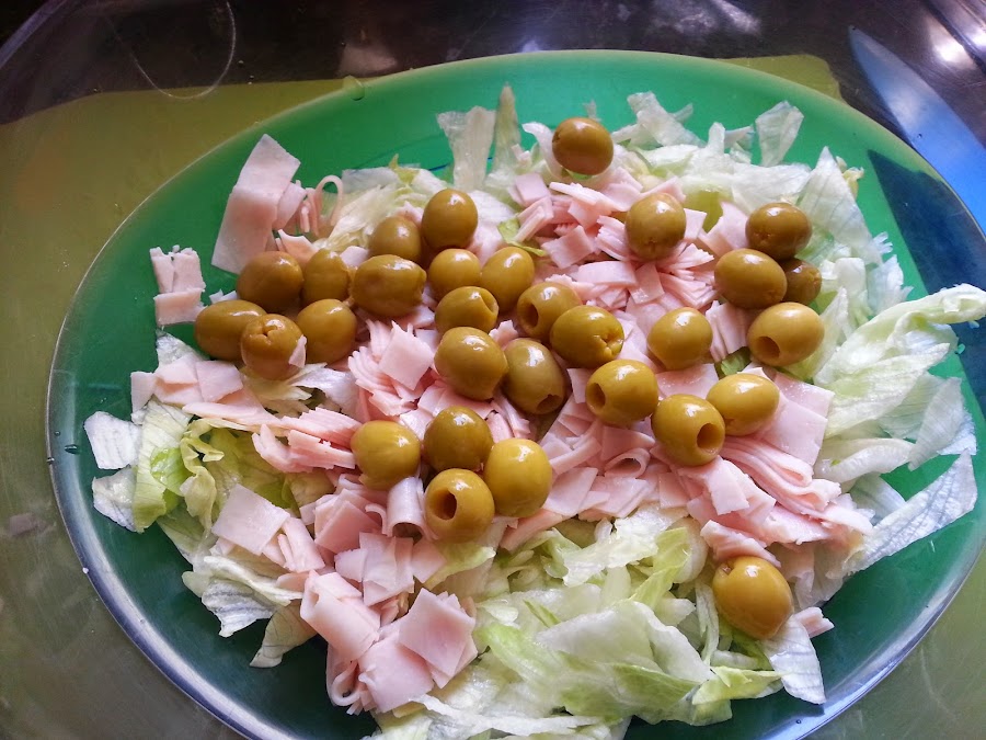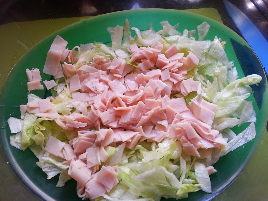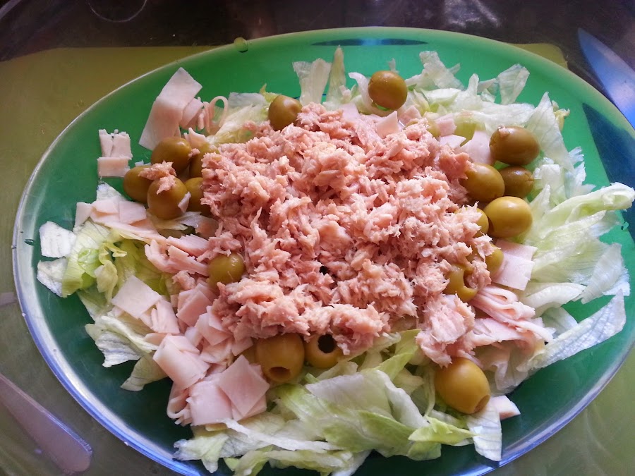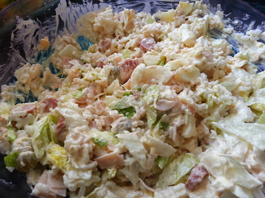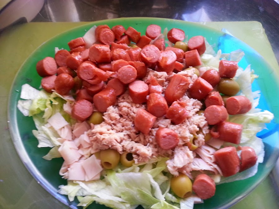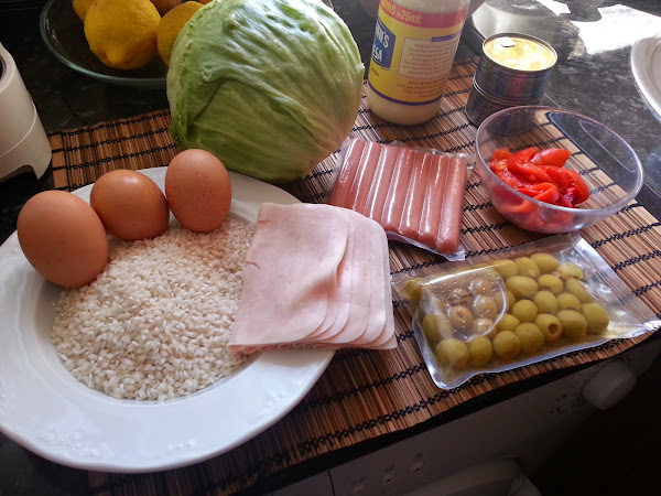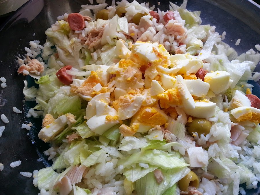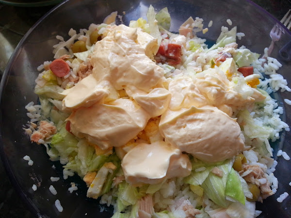 En un bol poner la lechuga cortada, el atún, el pavo cortado en trozos pequeños, el huevo, las salchichas cortadas a trozos y el arroz hervido. Añadir la mayonesa y remover bien. Adornar con el pimiento rojo.
