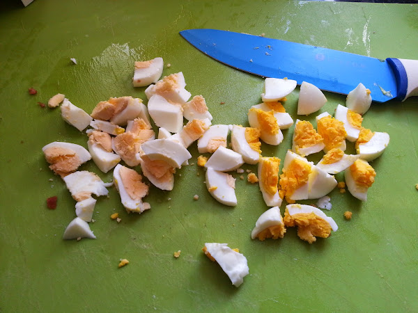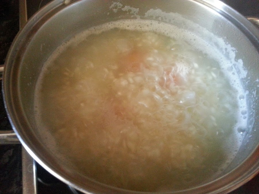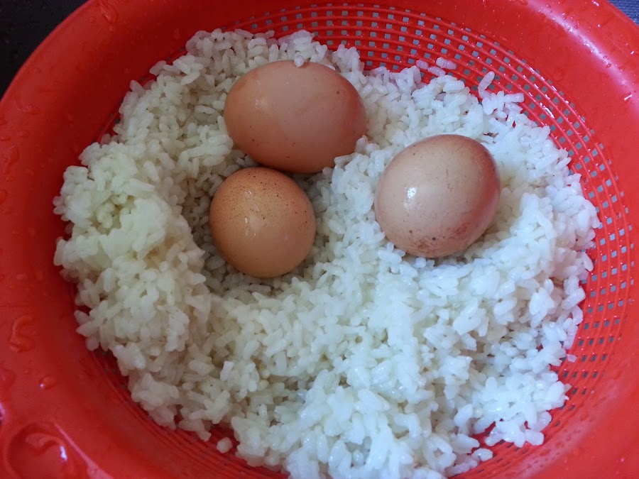 Hervir el arroz y los huevos. Cuando estén, los pasamos por agua fría para cortar la cocción del arroz.