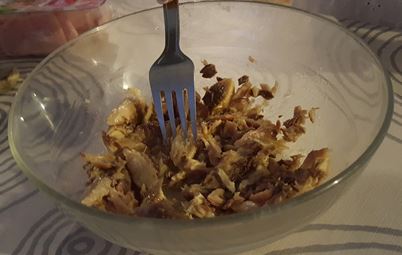 2.- En un bol vaciamos la lata de caballa y la desmenuzamos un poco.
