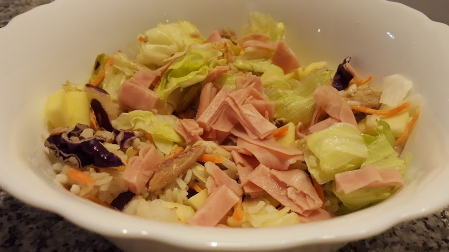 4.- Después incluimos la manzana a trozos, la lechuga, la col y el jamón york, que cortaremos a tiras.