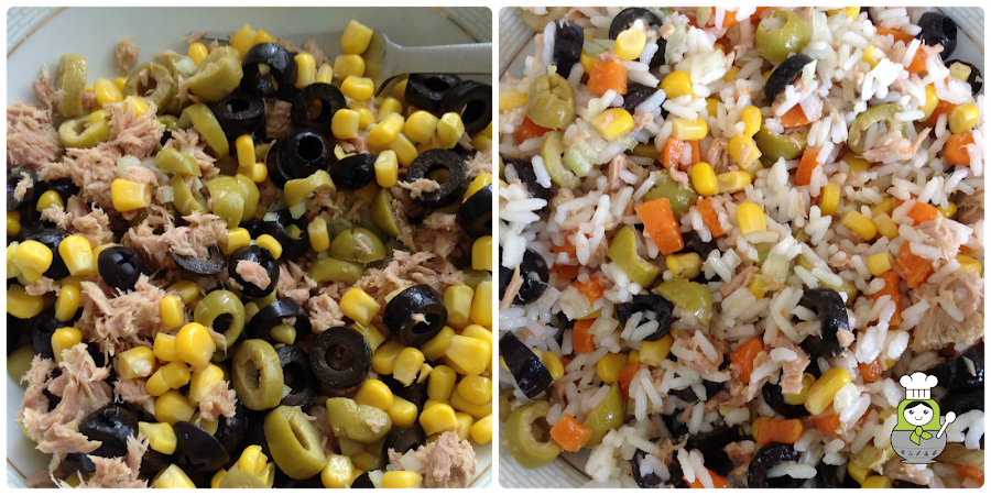 Mientras el arroz se cuece, picamos la cebolla en juliana muy fina y la pondremos en un bol grande para ensalada al que también añadiremos las aceitunas cortadas en rodajas, el maíz y el atún escurrido. Cuando el arroz y la zanahoria estén fríos los mezclaremos con los demás ingredientes.