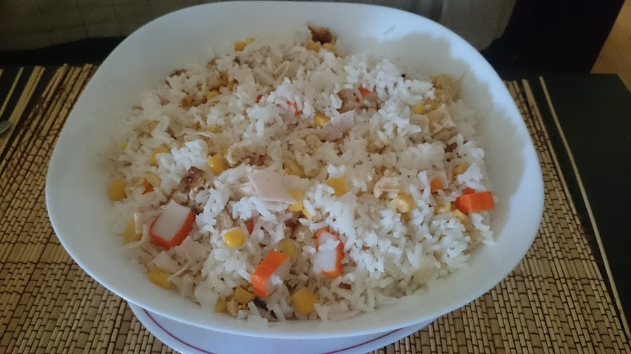 Para el veranito que no nos apetece comer cosas muy pesadas y calientes este plato es ideal y fácil de hacer, cogemos los dientes de ajo los pelamos y lavamos, en una cazuela ponemos un chorrito de aceite y lo ponemos al fuego, cuando esté caliente el aceite ponemos el arroz y los los dientes de ajo enteros a sofreír durante 2 min. aproximadamente, a continuación añadimos el doble de agua que de arroz, es decir que si hemos puesto 1 vaso de arroz pues 2 de agua, ponemos un poquito de sal y las hojas de laurel y tapamos con una tapa, lo dejamos a fuego medio hasta que se acabe el agua (más o menos tarda unos 20 min. aproximadamente), comprobar que no quede duro el arroz, y cuando esté listo lo pondremos en un bol y reservamos, a continuación vamos a hacer una tortilla francesa, cogemos los huevos, ponemos una pizca de sal y como una cucharada de las de café de azúcar de caña y batimos bien, ponemos una satén al fuego con un chorrito de aceite y cuando esté caliente echamos el huevo y tapamos con una tapa, dejamos durante más o menos 3 ó 4 min. y le damos la vuelta y tapamos otra vez pero ahora la mitad unos 2 min. queremos que nos quede finita la tortilla no gruesa así que la sartén sea más o menos mediana grande, cuando esté lista la sacamos y la cortamos en trocitos pequeños y añadimos con el arroz, seguidamente procedemos a hacer lo mismo con el jamón de york y con los tronquitos de mar, ahora añadimos el maíz, y sazonamos al gusto y removemos para que se mezcle todo bien, ahora ya por último y esto es opcional para el que le guste el pimiento verde, lo troceamos pequeñito y añadimos en al arroz (el pimiento en crudo), y ahora ya tendremos lista nuestra ensalada de arroz, la dejamos una horita en la nevera para que se enfríe y servimos, a la hora de servir a unos les gustará tal cual, y a otros y lo recomiendo con mahonesa, ya me diréis, espero que os guste, buen provecho