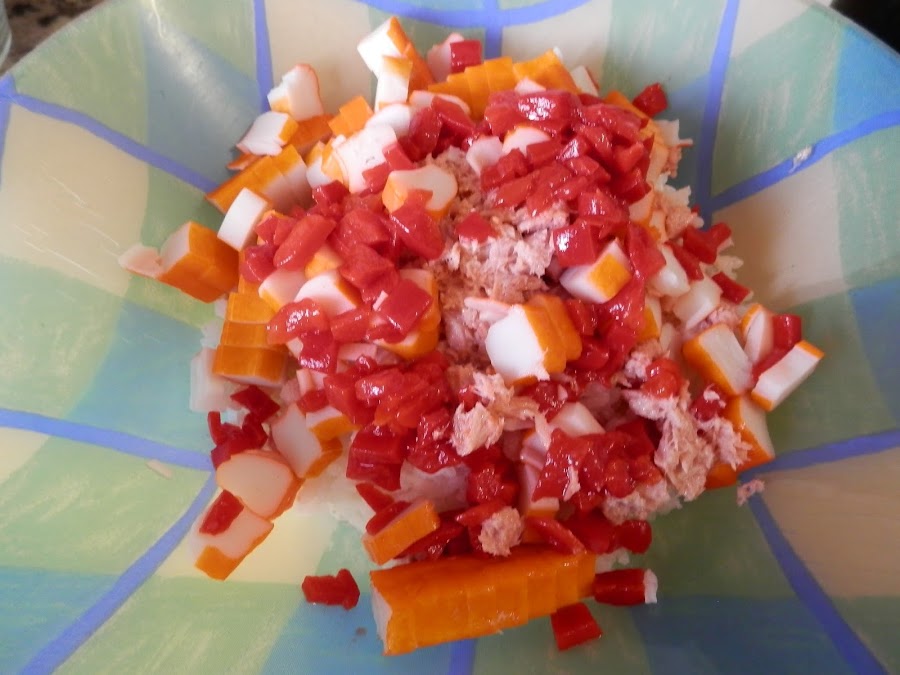 Partimos el surimi y el pimiento morrón en trocitos pequeños.