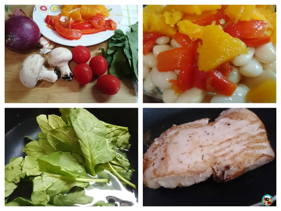 1 lomo de atún blanco, 1 mano de espinacas frescas.