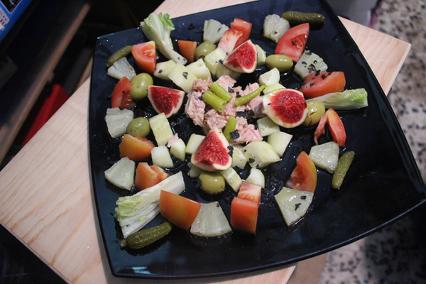 Cortamos en cuatro trozos cada higo y los colocamos sobre el pepino.