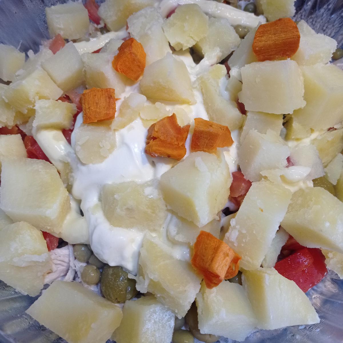 Cuando esten cocidas cortar en cubos pequeños las papas y zanahorias y reservar