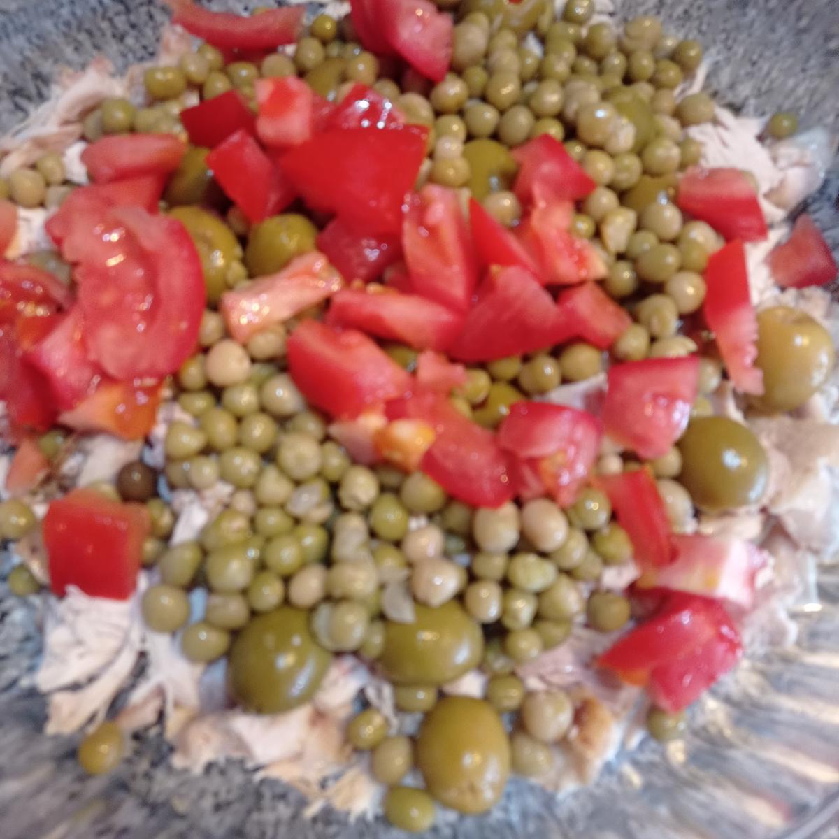Incorporar al bol del pollo, las verduras, las aceitunas, sal, pimienta, la mayonesa y la crema , una o dos cucharadas de aceite de oliva , las arvejas y los tomates y mezclar.