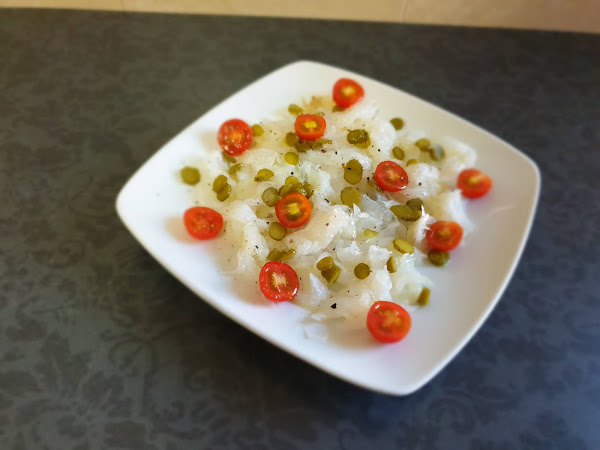 Ahora cortamos los pepinillos en rodajas y también repartimos por el plato.
