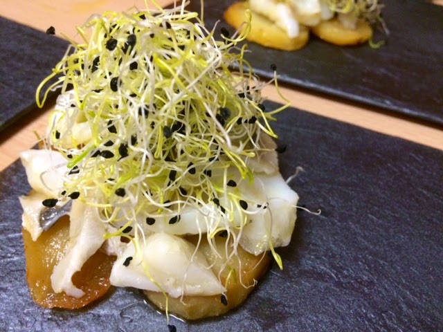 Para ello, ponemos 4 patatas como base y les echamos una pizca de sal maldon. Colocamos encima de las patatas un montoncito de lascas de bacalao y por último un puñadito de germinados de puerro.