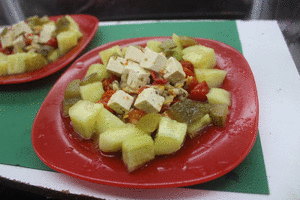 Troceamos los pepinillos en vinagre y los mezclamos con los daditos de pepino, aleatoriamente.