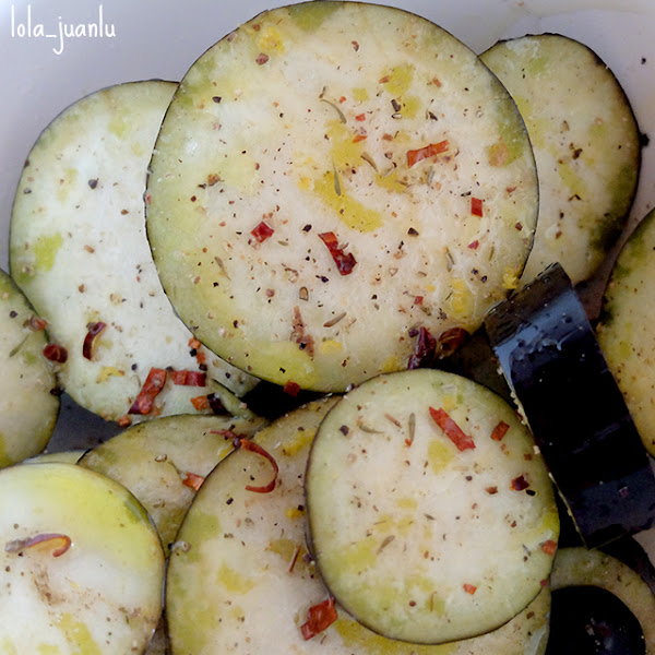 Sazonamos con el chile, el zumaque, la sal y la pimienta. Añadimos el aceite de oliva y comprobamos que todas la rodajas de berenjena están bien sazonadas.