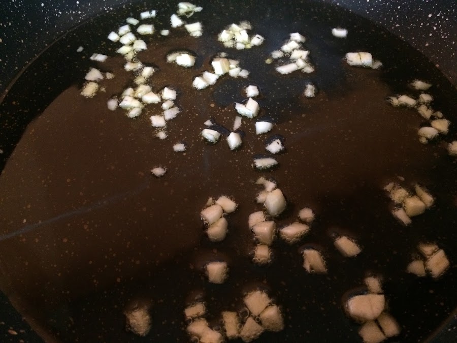 En una sarten ponemos aceite de oliva, unas 6 cucharadas, y los ajos picados. Doramos.
