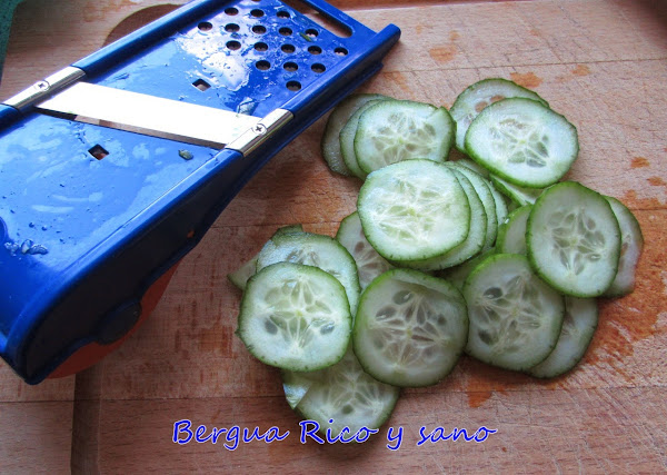 1. Preparamos nuestras verduras. Lavamos el pepino y lo cortamos en láminas muy finitas con ayuda de una mandolina.