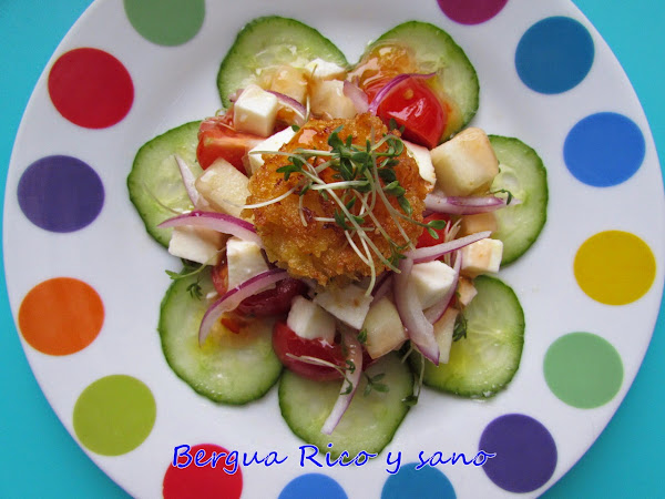 Hoy os traigo una ensalada en la que el verde lo ponen el pepino y el berro de agua, una planta muy popular en Dinamarca. Añadimos aún más vitaminas y dulzor con el tomate y la pera, contrastamos el sabor con la cebolla y coronamos con una crujiente vieira empanada en panko, el pan rallado japonés, para añadir otra textura. Los toques caprichosos vienen de la mano de la salsa agridulce y del queso; hoy uso mozzarella fresca porque me apetece y quería que la vieira fuera la auténtica protegonista, pero Dinamarca es de hecho productora de su propio feta, así que esa sería otra buena opción. Como dato curioso, parte del queso feta que se consume en Grecia, se importa de hecho de Dinamarca. Para 2 personas como plato único: