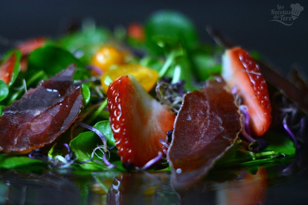 Hola a todos... Hoy os traigo una maravillosa ensalada preparada con berros, brotes de rábano, tomates cherry, fresas y el producto estrella, cecina de ciervo!! Este producto es una innovación que elaboran mis amigos de Venison, quienes son criadores de ciervos y comercializan sus productos, la carne de ciervo aparte de estar riquísima es baja en grasas y muy nutritiva, por lo que es una estupenda alternativa!! La cecina está deliciosa y con esta ensalada, uhmmmm, no puede estar mejor!!