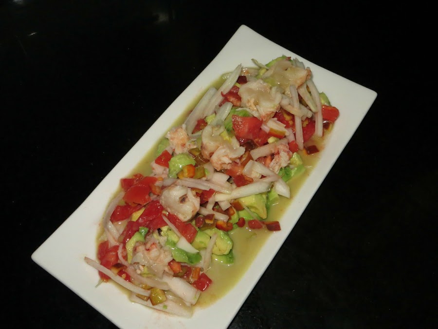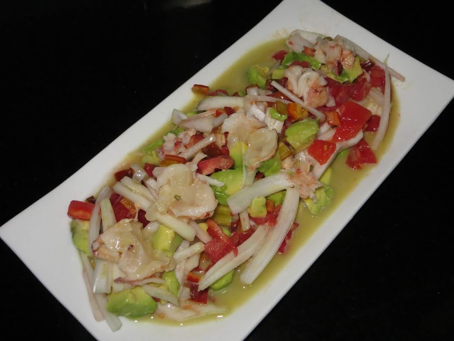 Echamos en un recipiente la mostaza, el limón, el coral y el aceite de oliva y batimos bien hasta emulsionar la mezclar. A continuación, comenzamos con nuestra ensalada, pelando el tomate y el aguacate lo echamos en un plato junto con la cebolla y el pimiento, añadimos la vinagreta por encima y ya está listo para servir. Un entrante suculento para estas Navidades.