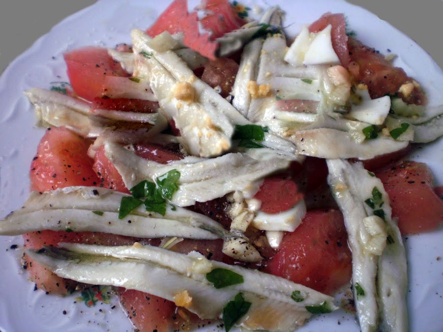 Se majan en el mortero, los ajos con la sal, una cucharadita de perejil picado a cuchillo y unas hojas de hierbabuena. Se riega con el zumo de limón, se espolvorea con pimienta molida, un chorrito de aceite y 1/2 vaso de agua fría; se remueve, se riega sobre el tomate y los boquerones, se lleva la ensaladera al fresco y se sirve con el huevo cocido por encima...........
