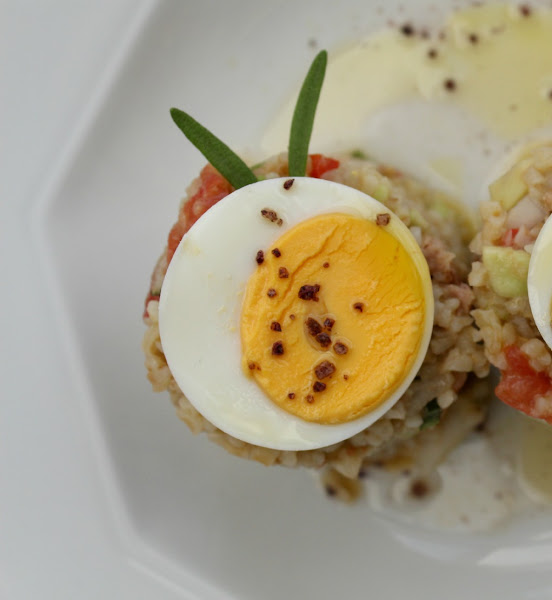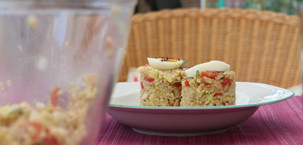 Mezclamos el boulgour con el resto de ingredientes. Punto de sal, aceite, vinagre y servimos decorando con huevo y sal de vino.