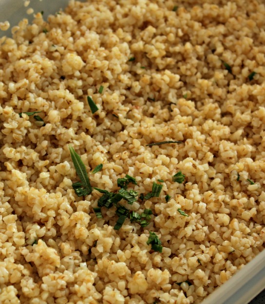 Una vez cocido el boulgur, escurrimos y extendemos para que se enfríe. Aliñamos con las hojas de romero picadas, punto de sal y aceite (Si es aromatizado, mejor) y el zumo de limón o vinagre de vino blanco.