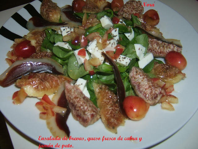 Lavar las brevas y cortar en cuartos, repartir por encima de los canónigos. Partir en dados el queso, deshuesar las cerezas y añadir al resto de los ingredientes, aliñar y colocar el jamón de pato y unas hojas de albahaca picada (si es fresca mejor).