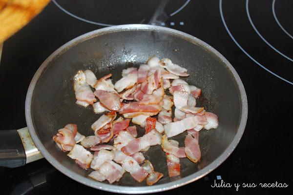 Salteamos el bacon en una sarten sin poner aceite o lo ponemos unos minutos al microondas.
