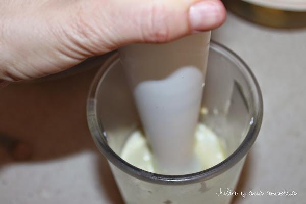 En el vaso de la batidora ponemos los quesos, el zumo de limón y la pimienta. Lo batimos todo muy bien.