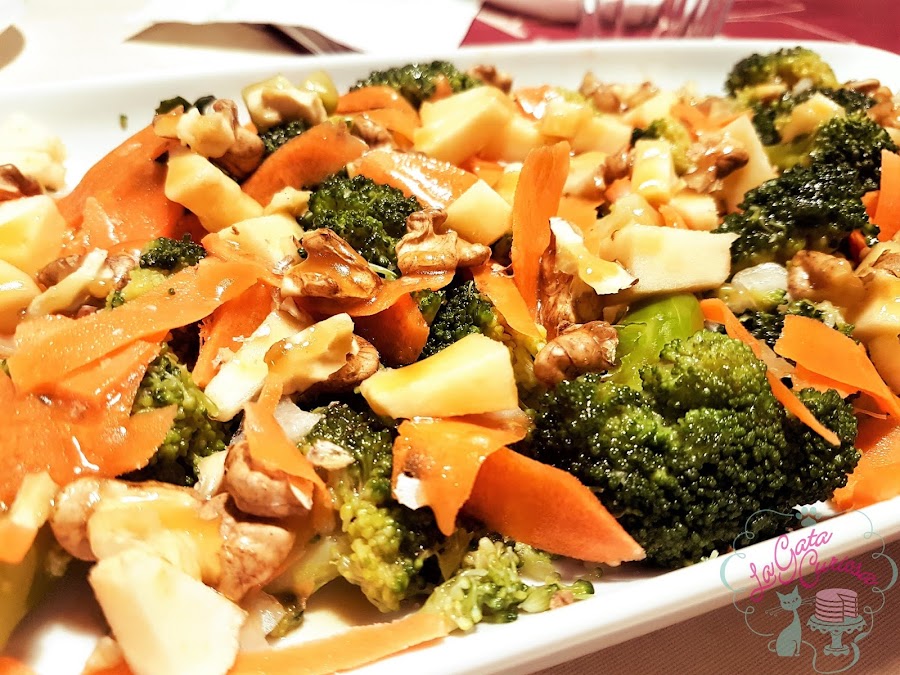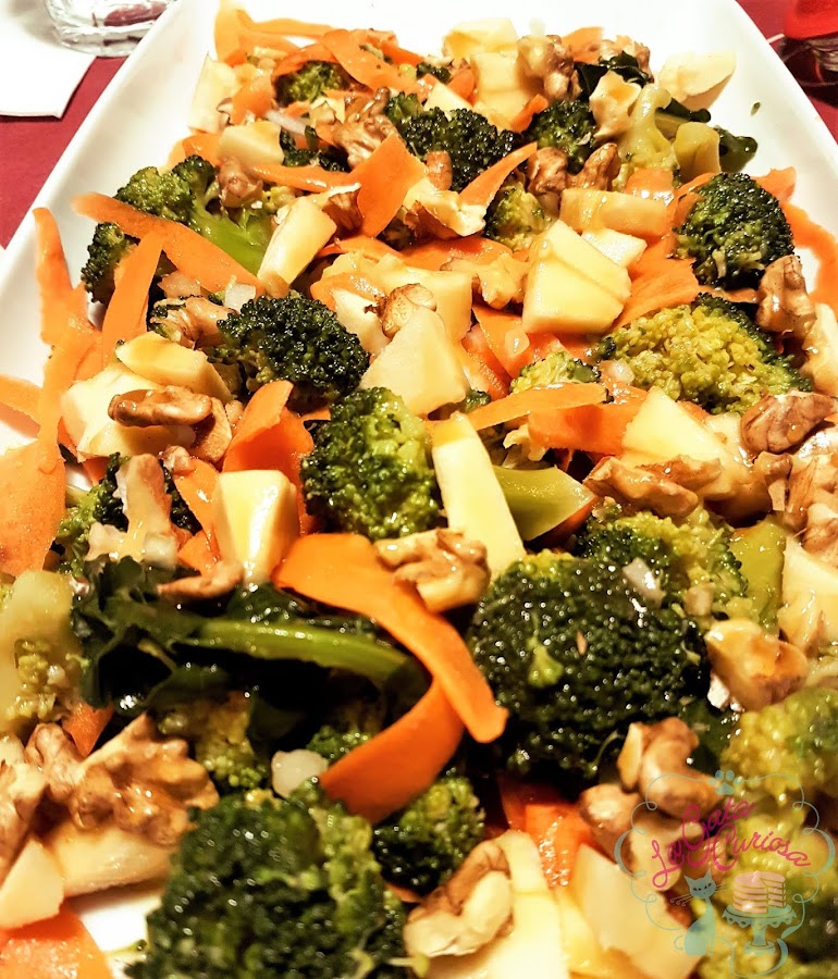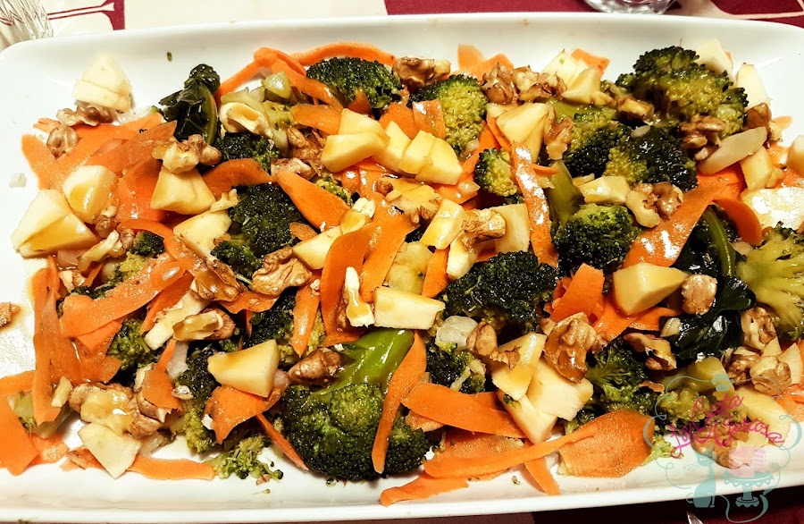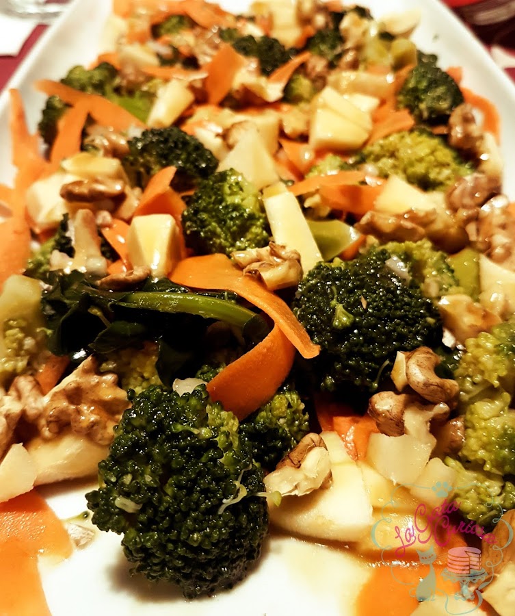Colocamos en una fuente el brócoli, pondremos por encima la manzana en trocitos, la cebolla cortada pequeña, las zanahorias en tiras o rodajas, las nueces cortadas en trozos y si lo usamos el queso en cuadraditos. Salamos un poco