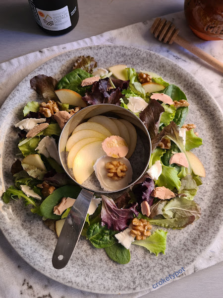 INGREDIENTES: 50 gr de brotes (la variedad que más os gusten) , foie mi cuit, queso de cabra en rulo, media manzana fuji o la que más os guste, nueces y para la vinagreta por cada cucharada de miel, media de vinagre y dos cucharadas de aceite de oliva. Sal al gusto