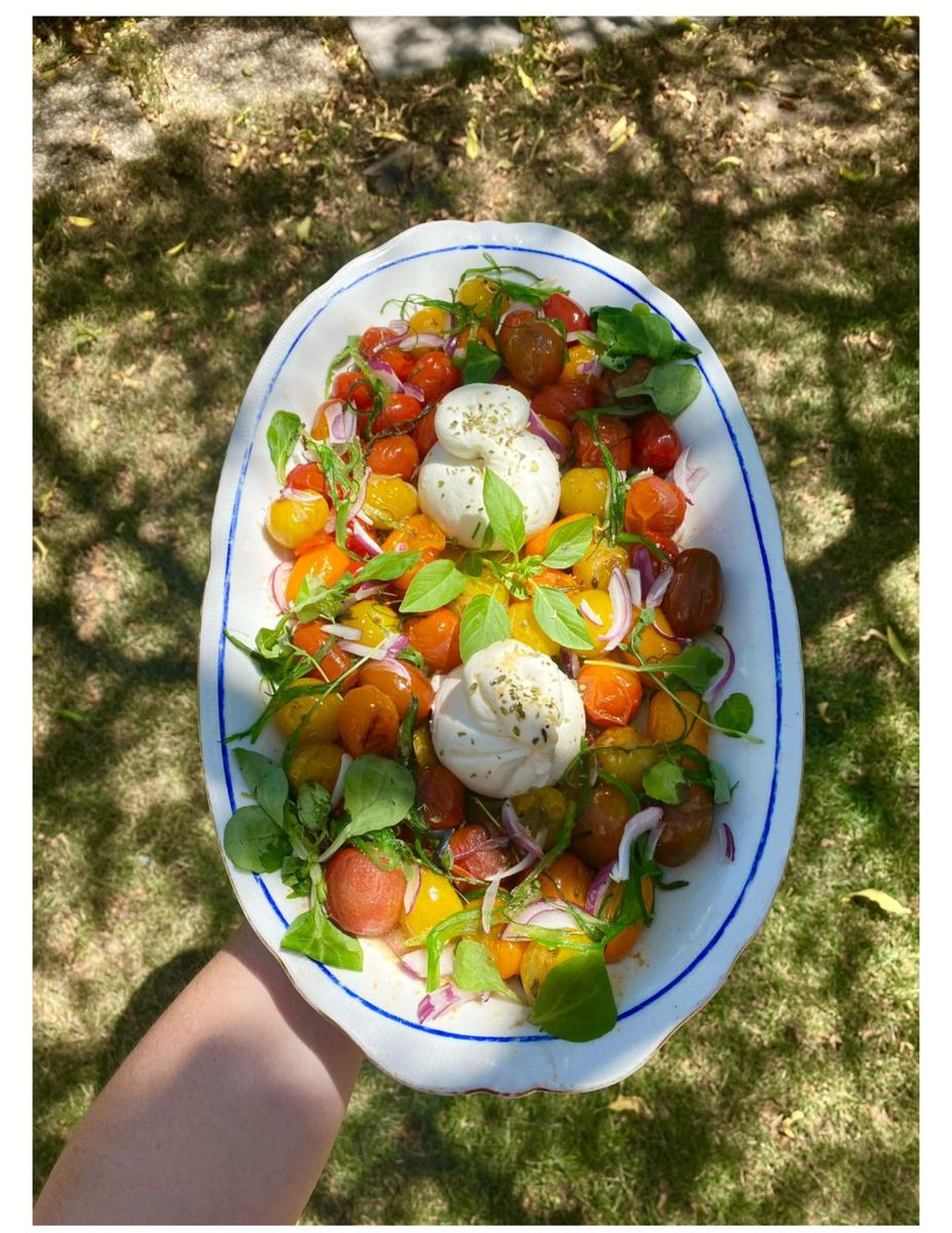 Pon en una bandeja grande, donde vas a servir la ensalada, las burratas, en una sartén u olla grande pon aceite de oliva y saltea las hierbas, unas ramitas de cada una, una vez que esté bien caliente, incorpora los tomates con la piel y cocina un rato hasta que veas que se van arrugando, pero que no se les cae la piel del todo, agrega sal y pimienta. Reserva. Corta la cebolla morada en juliana, Reserva.Arma la ensalada, en la bandeja donde has puesto la burrata, coloca los tomates, la cebolla morada, unas hojas de rúcula, el wakame. Echa un chorro de AOVE, de vinagre balsámico, rectifica la sal y si no. le agregas más y listo!