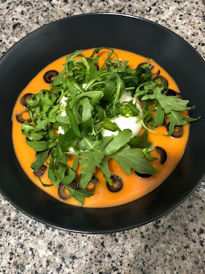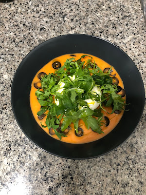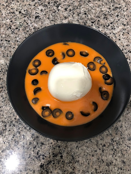 3. - Cubrimos los filos de salmorejo con las aceitunas negras cortadas en láminas.