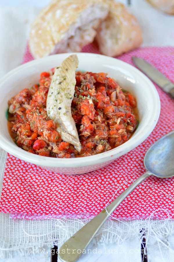 Cuando le preguntas a mi madre que recuerdos le trae, le traslada a su infancia en Huertañalda, cuando cogían los últimos pimientos rojos de la huerta y con unas latas de atún y ese majado de ajo, comino y orégano, se hacían esta ensalada para llevar a la jornada de la aceituna y mojar con un buen pan rústico al calor de una hoguera de ramas de olivo secas...