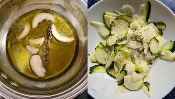INGREDIENTES: 1 Calabacín, 40 gr. de nueces picadas gruesas, 4 tiras de piel de limón, zumo de limón, una ramita de tomillo, 1 ajo aplastado, albahaca fresca, aceite de oliva Aove, sal y pimienta