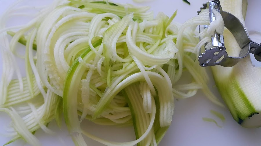 Empezaremos preparando el calabacín. Lo pelamos y cortamos con un pelador de verduras para que nos salgan fideos largos y finos.
