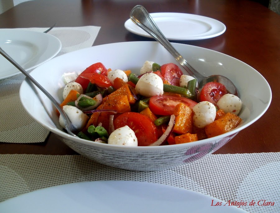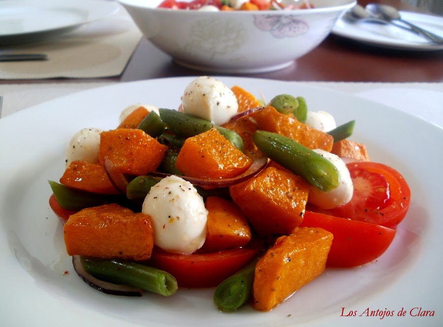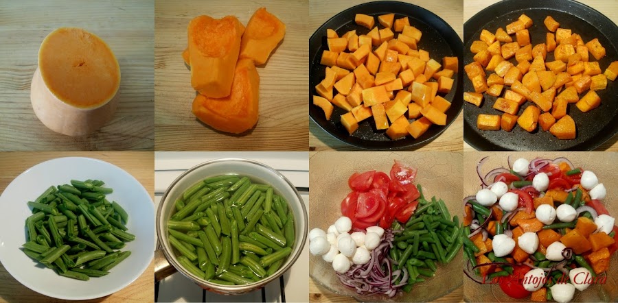Mientras la calabaza está en el horno, preparamos los demás ingredientes de la ensalada. Lavamos las judías, les retiramos los extremos y las cortamos en tres partes. Ponemos a calentar un poco de agua en un cazo, cuando el agua rompa a hervir, adicionamos las judías y las cocemos por 5 o 6 minutos a fuego medio. Escurrimos las judías y las echamos en la ensaladera. Lavamos los tomates y los cortamos en gajos. Cortamos la cebolla en julianas finas y escurrimos la mozzarella fresca. Echamos los cubitos de calabaza calientes en la ensaladera, aderezamos la ensalada con una cucharada de vinagre, dos de aceite de oliva y salpimentamos al gusto. Removemos y servimos.