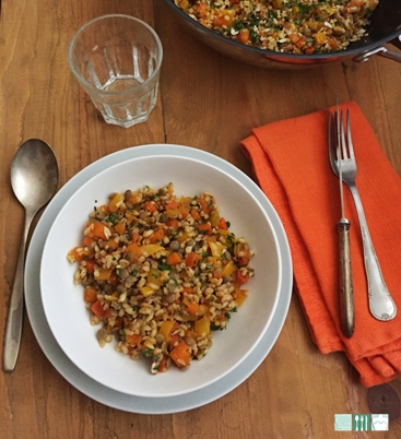 Mezclar las lentejas, bulgur y cebada con las zanahorias, la calabaza, las almendras, el cilantro y el ras el hanut o las especias. Aliñar con el zumo de limón y salpimentar.Simplemente, buenísimo!