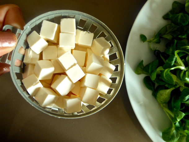 A continuación, escurre el queso fresco para ensalada de la salmuera y mézclalo con las hojas de canónigos.