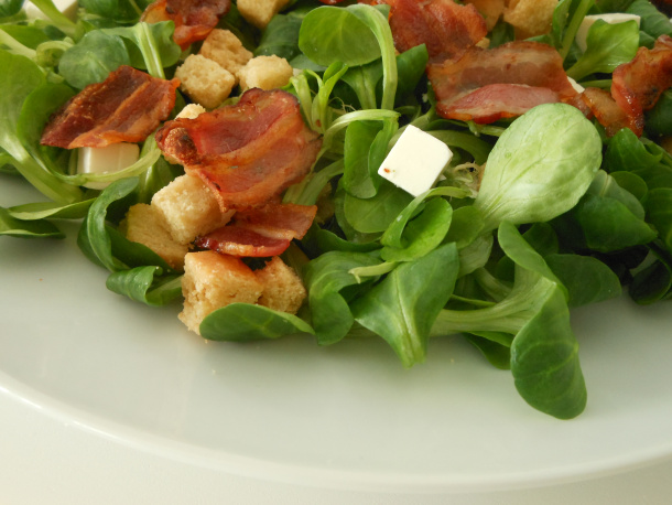 Una vez cocinado el bacon, abre la bolsa de canónigos y vacíala sobre la ensaladera.