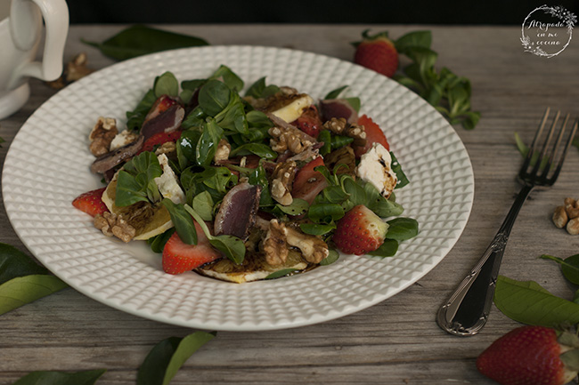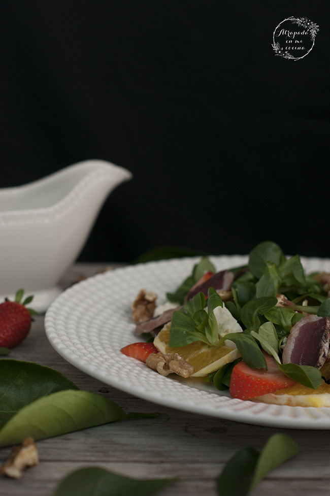 Acabadas las fiestas navideñas también ponemos fin a las comidas copiosas en familia. Han sido muchos días de fiestas y muchas comilonas. Y ahora toca abrocharse el cinturón y empezar a reducir en calorías, para volver al peso que teníamos antes de las navidades. Junto con los caldos depurativos las ensaladas son la mejor propuesta. Yo las tomo como plato único, por lo que le he añadido a ésta un poco de jamón de pato casero y un poco de queso feta, también nueces. Además la vinagreta lleva zumo de naranja, con lo que podemos reducir mucho el añadido del AOVE.