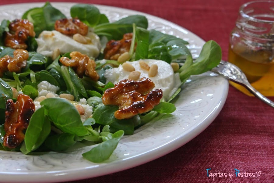 Esta es una ensalada con lo que pillé de la despensa, unos canónigos, piñones tostados, nueces caramelizadas y queso de cabra a la plancha...más un aliño especial.