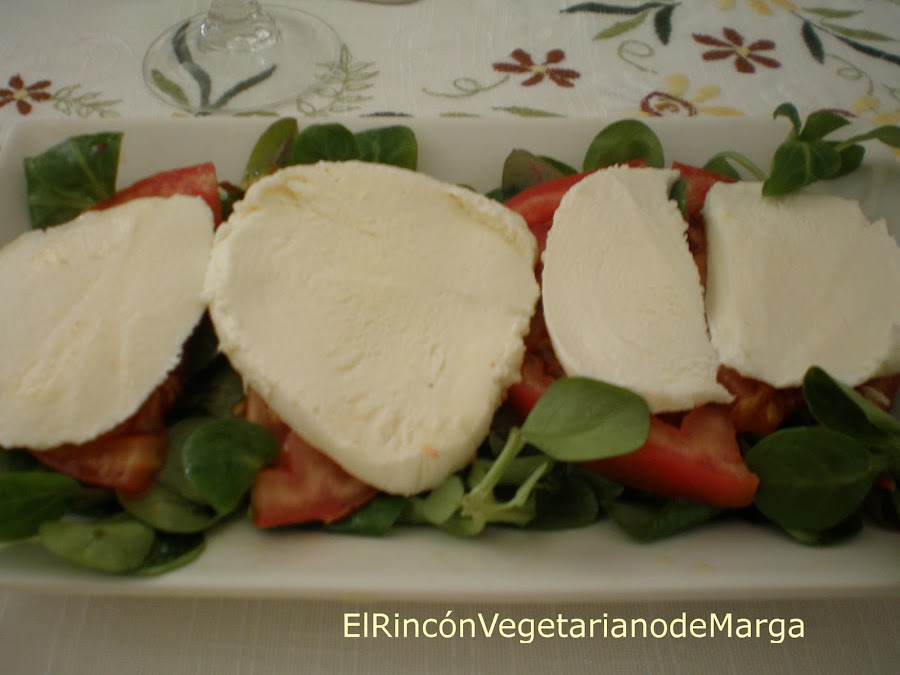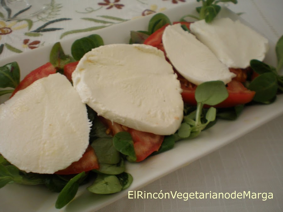 Ponemos una cama de canónigos en un plato bonito, unas rodajas de tomate por encima y por último unas rodajitas de queso mozzarella. Lo regamos con aceite de oliva y sal.