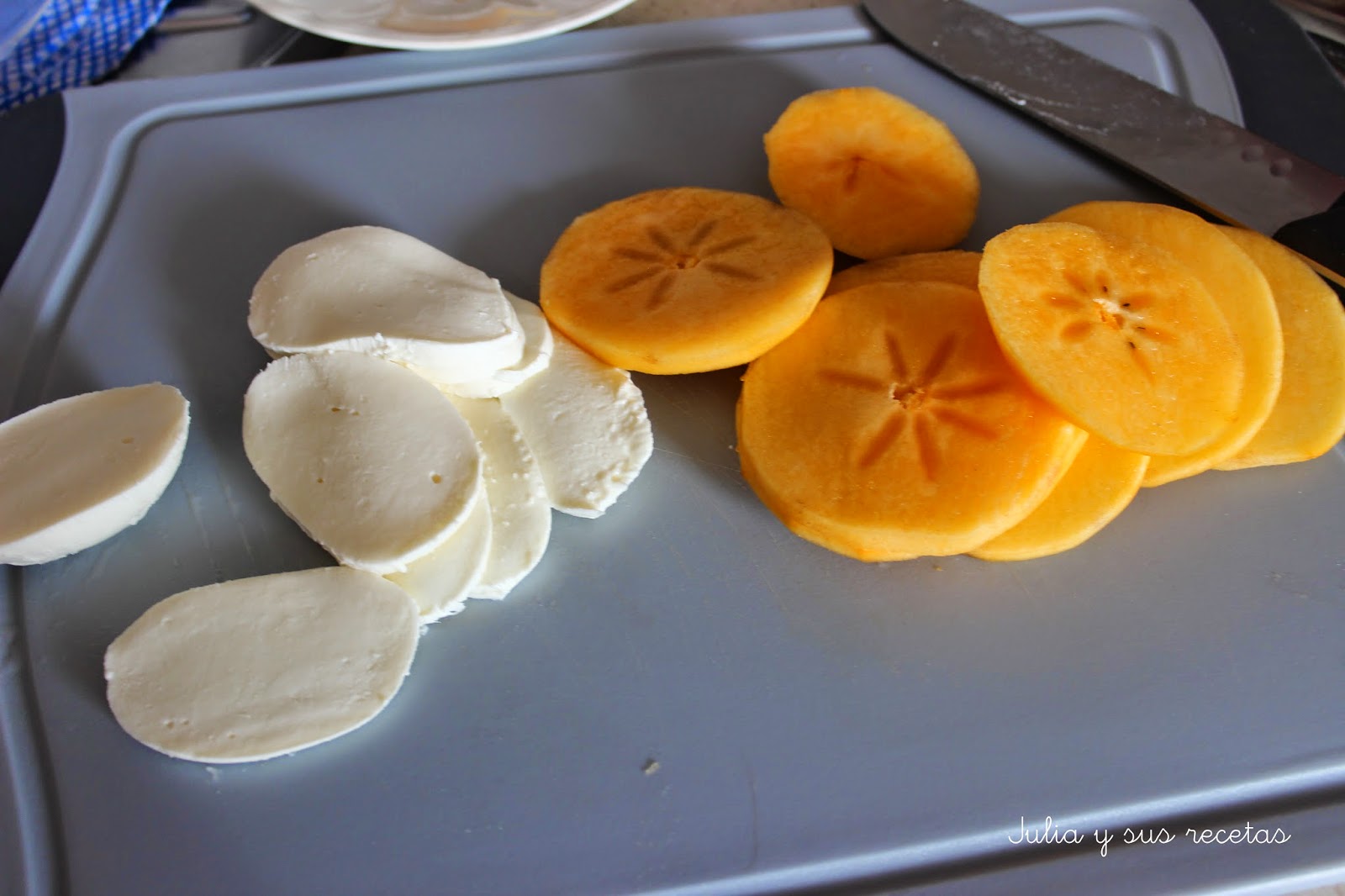 Pelamos el caqui y lo partimos en rodajas. Lo mismo hacemos con la mozzarella.