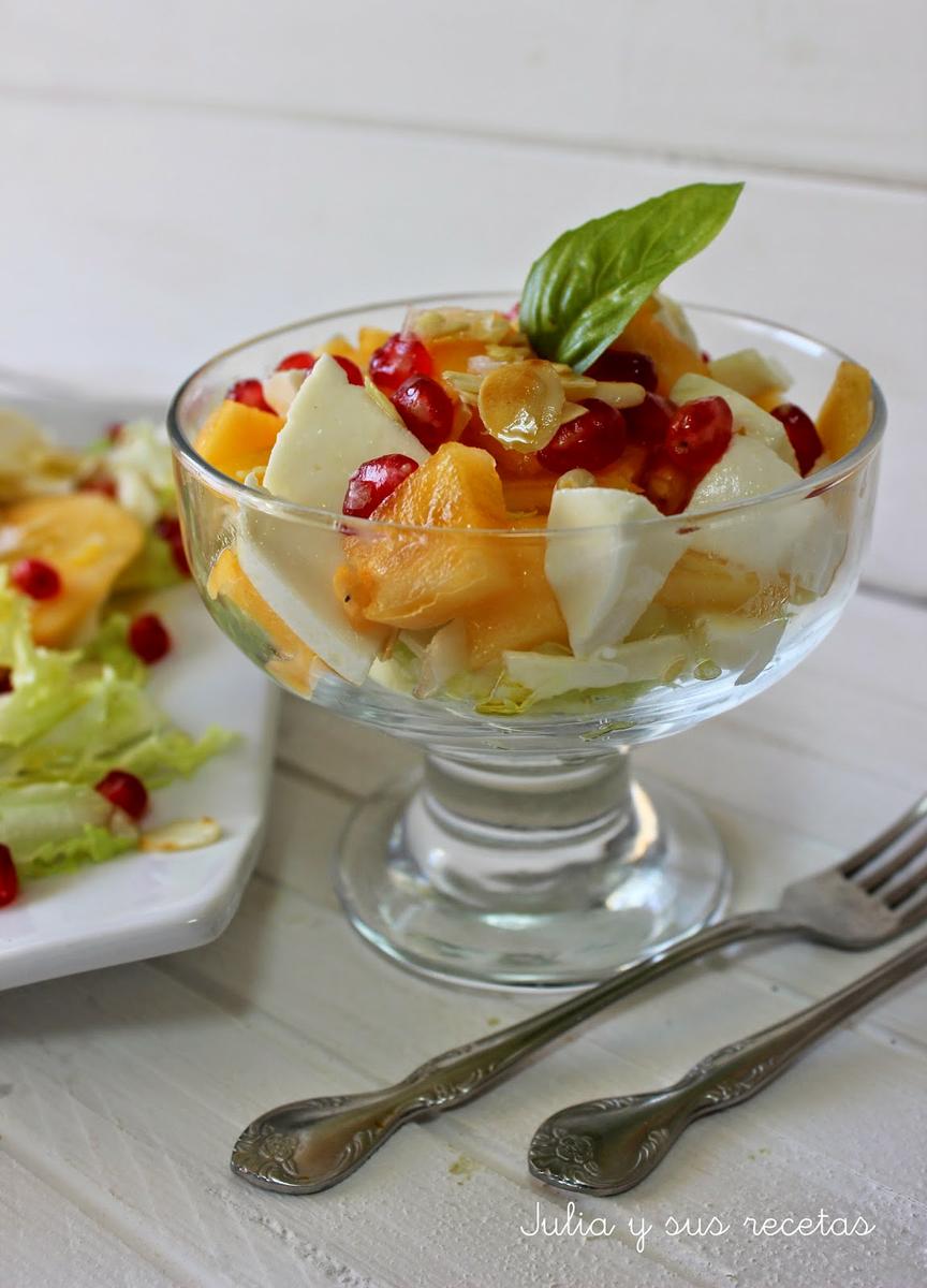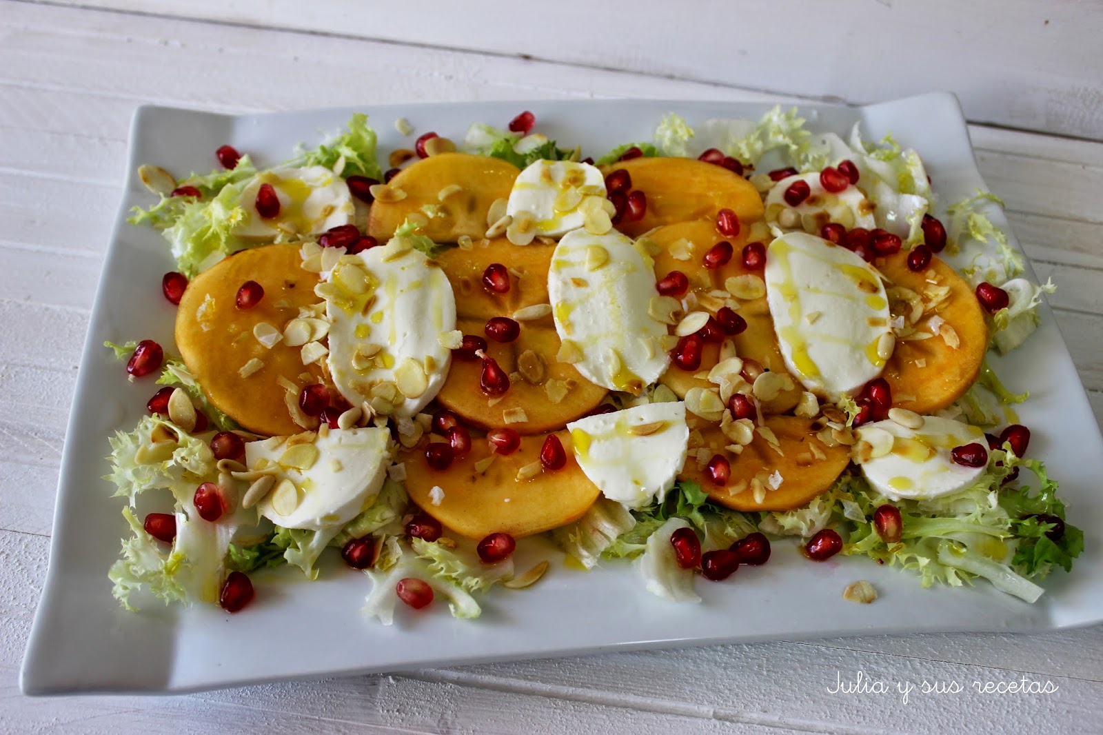 Yo me he decidido por hacer una rica ensalada con caqui persimon. Con vistas a tener un primer plato en las fiestas que se aproximan, la Navidad, esta ensalada quedaría estupenda en nuestras mesas. Si la presentamos en una copa queda elegante y muy vistosa por su colorido y ademas deliciosa con el contraste de sabores, o para cualquier otro día , no tenéis que esperar a Navidad para degustarla.