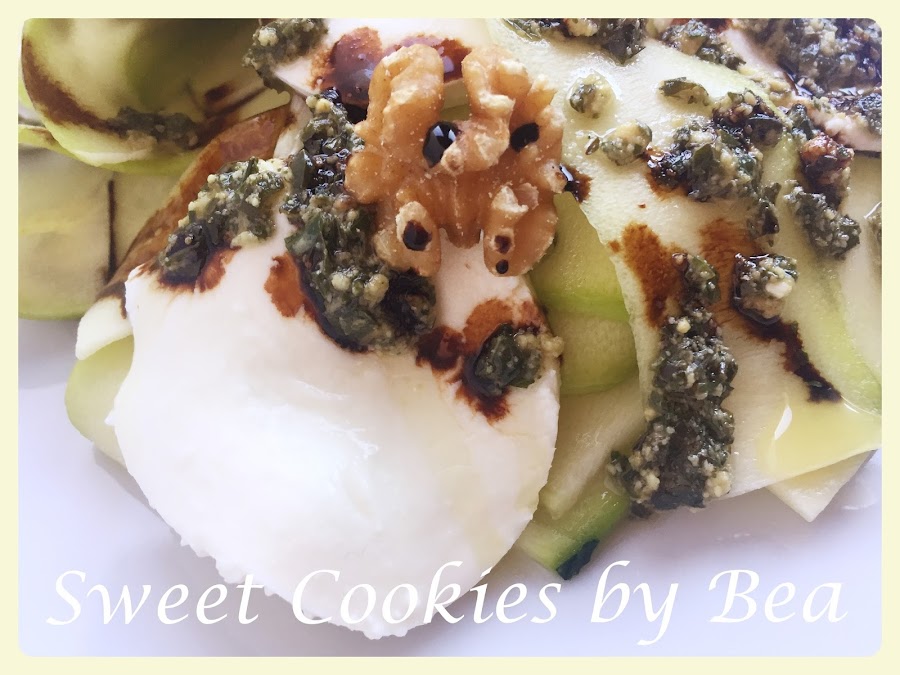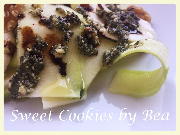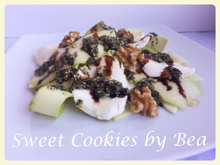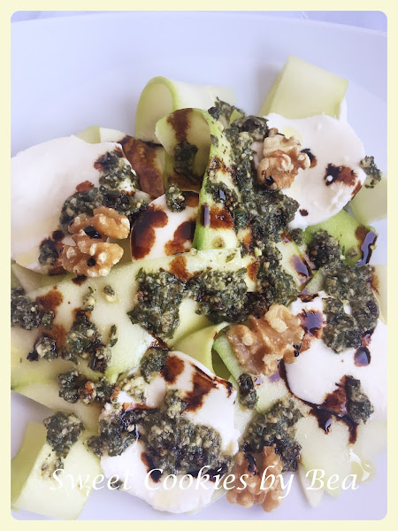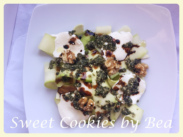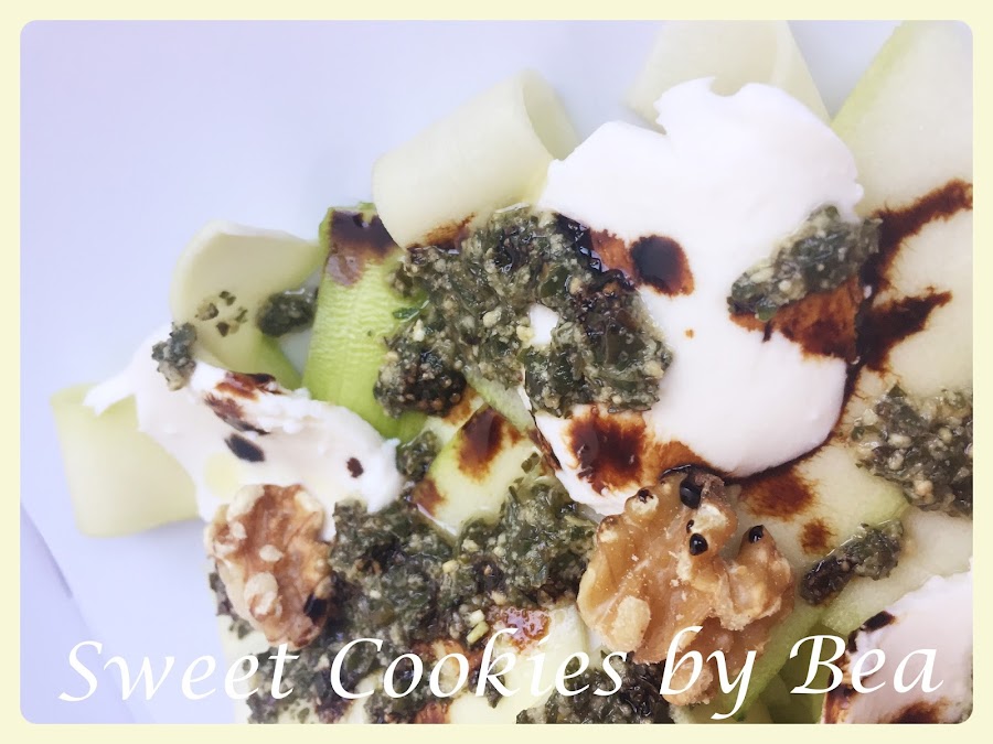 La probé una vez que estuve comiendo en La Taberna Los Gallos y me dio la idea para poder hacer esta ensalada en casa, exactamente no recuerdo que lleva la de ellos, lo único seguro es el calabacín y el pesto. Pero la verdad que tanto esta como la de ellos está bien rica