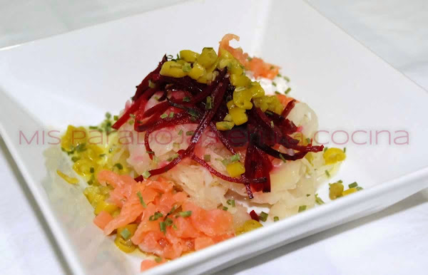 Escurrir el chucrut y disponer sobre él la remolacha y las piparraks cortadas en rodajas. Hacer unas quenelles con la mouse de queso y cortaremos el salmón en tiritas que colocaremos al gusto. Regar con unas gotas de aceite y decorar con cebollino. Servir frío y remover antes de degustar.
