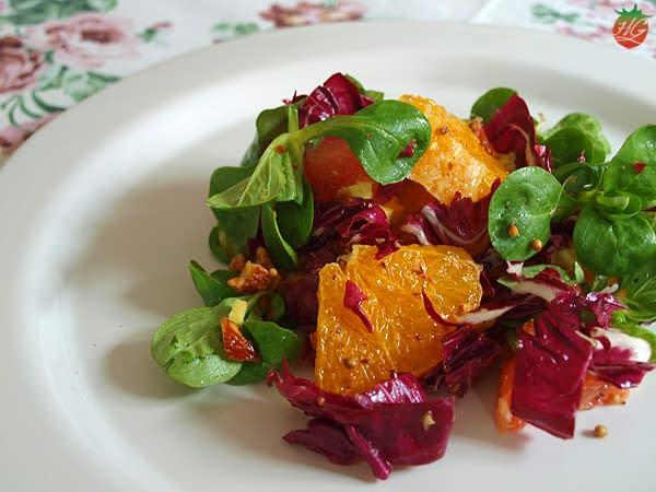 Primero, tenemos que pelar los cítricos; lo haremos con un cuchillo afilado, eliminando al máximo la parte blanca amarga que las recubre. Después, los cortamos de forma transversal haciendo rodajas de 1/2 cm de grosor aproximadamente, para terminar cortando en cuartos cada rodaja. En este punto, aprovechamos para retirar la membrana central. Los reservamosAdemás, lavamos y secamos bien los canónigos y la achicoria. Después, picamos esta última.