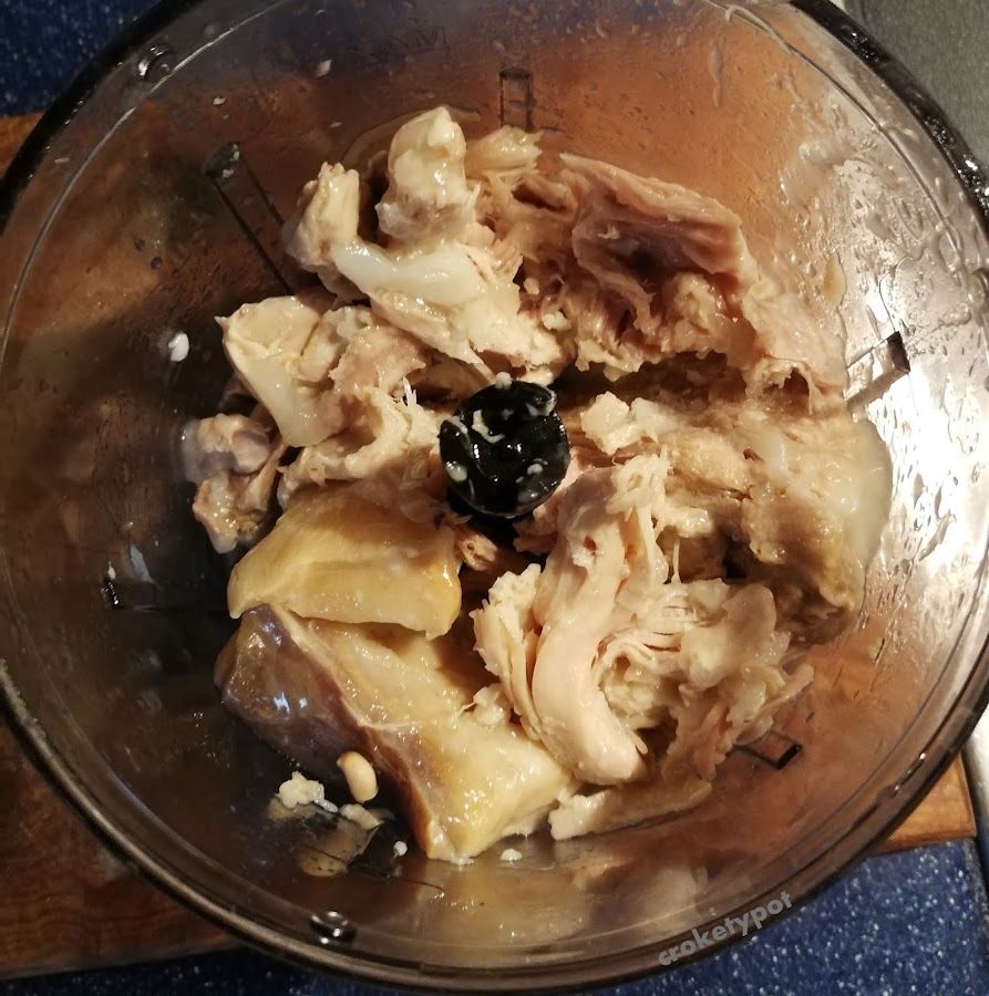MONTAJE DEL PLATO: Ponemos la carne que nos ha quedado del cocido, con el tocino incluido en la picadora, lo picamos y reservamos en el frigorífico.