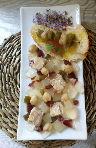 Veréis que está acompañado de unos pimientos en vinagre, si no habéis probado esta delicia para acompañar guisos o incluirlos en ensaladas, os lo explico, preparad con antelación y tendréis para darles mucha aplicación.